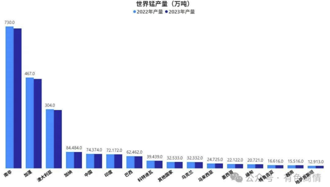 中國錳礦儲量2.8億噸,排名全球第三位,這些錳礦資源主要集中于南方地區(qū),像廣西、湖南、云南、貴州、重慶、湖北等省區(qū)是我國錳礦資源的主要聚集地。然而,我國錳礦資源在品位方面存在明顯短板,平均品位約為21%,富礦(氧化錳礦 Mn>130.00%、碳酸錳礦石 Mn≥25.00%)僅占全國總儲量的 6.43%,貧錳礦卻占到了 93.60%。