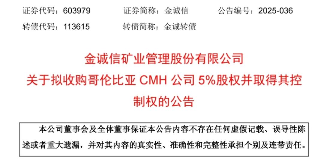 金誠(chéng)信(603979)繼續(xù)加大海外礦業(yè)布局。5月8日晚,金誠(chéng)信公告,擬收購哥倫比亞CMH公司5%股權(quán),并取得其控制權(quán)。公司同時(shí)擬投資2.31億美元建設(shè)Alacran銅金銀礦項(xiàng)目。
