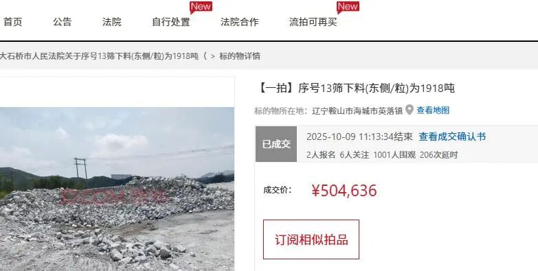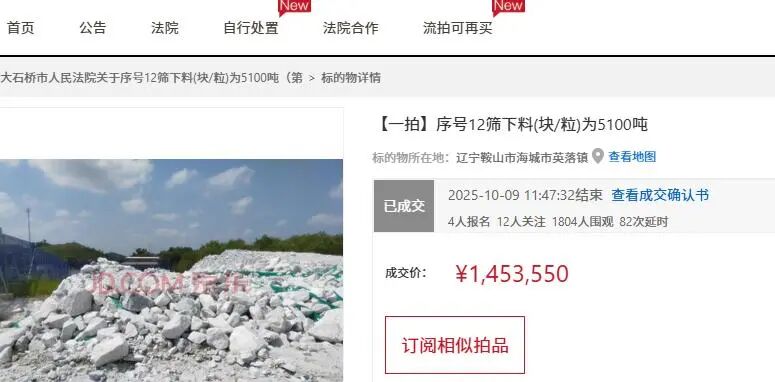 值得注意的是,也是在10月9日,同樣是存放在遼南鎂礦耐火材料廠青山懷鎂礦廠區(qū)內的另外一批礦石也是被拍賣,礦石重量為1918噸,不過從圖片來看,礦石質量要差一些。