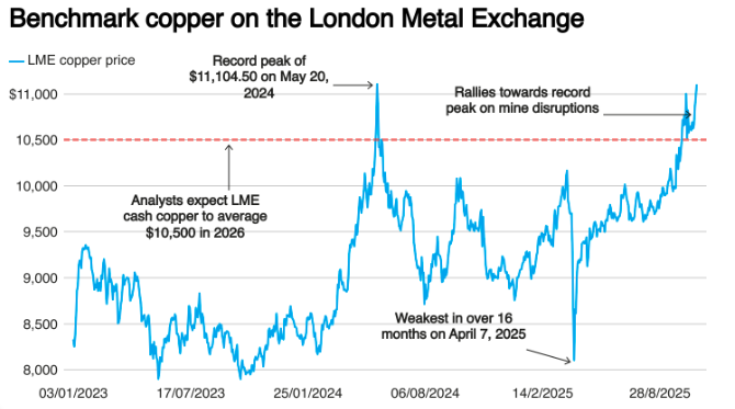 業(yè)內(nèi)30位分析師的預(yù)測(cè)中值顯示,2026年LME現(xiàn)貨銅均價(jià)料為10500美元/噸,較7月份上次調(diào)查的9796美元預(yù)測(cè)上調(diào)了7.2%。